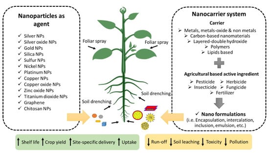In crop science, nanoparticles are generally used as fertilizers, growth stimulators, photosynthesis enhancers, and in the management of pests and diseases [59]. Nanoparticles provide tremendous benefits in agriculture, such as increasing the quality and quantity of crop yields, increasing shelf life, enhanced site-specific distribution, and the absorption of nutrients and active ingredients. It also has low toxicity and helps to reduce the leakage of nutrients and active ingredients, while reducing the environmental pollution. Nanoparticles can function by two different mechanisms, firstly as a stimulant or protective agent, and secondly as a nanocarrier system for existing fertilizers and pesticides.