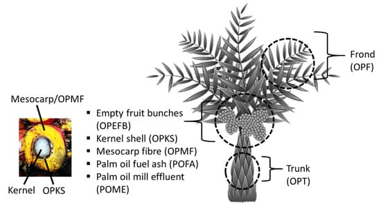 The produced oil palm biowaste mainly comes from fruit bunches, fronds, and trunks (Figure 3). First, in the production of palm oil, only the fruit is taken, leaving the oil palm empty fruit bunches (OPEFB) as a waste. Then, CPO is extracted by pressing the oil from the fruit mesocarp, while CPKO is extracted from the fruit kernels. The process produces oil palm mesocarp fiber (OPMF) and an oil palm kernel shell (OPKS). Besides, POME is a by-product or residue obtained in the production of CPO. Meanwhile, POFA is a residue generated from the combustion of oil palm bunches and palm kernel in palm oil mills. Apart from that, the harvesting of oil palm produced oil palm frond (OPF) and oil palm trunk (OPT) wastes.