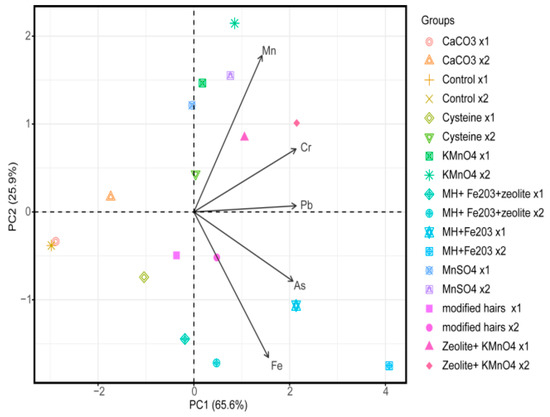 The results of this study indicate that minimum concentration of Cd, As, Pb and Cr were observed in treatments that contain iron oxide, modified hairs, zeolite, and Mn. In the literature, many scientists have reported the efficiency of the iron oxide, modified hairs, zeolite, and Mn in reducing heavy metal toxicity [6,52,53,54]. The treatments that contained MHs and iron oxide were statistically highly significant in reducing the available and total HMs and metalloids in plants and soil followed by the treatments that contained zeolite and KMnO4. Iron oxide and human hairs have been reported to be effective in the in situ remediation of HMs. The smaller size of iron oxide and hairs provided more surface area to HMs and increased the adsorption sites that resulted in an increase in the sorption of metals and metalloids. The iron oxide has been reported to enhance the formation of iron plaque, which acts as a barrier to reduce the permeability of roots towards HMs [55]. The competition for adsorption sites through Fe and H ions, the formation of soluble complexes, high surface area, high CEC, and specific retention may have played a significant role in decreasing the availability of Cd, Pb, Cr, and As. The binding capacity of iron oxide towards heavy metals, including Cd, As, Cr, Pb, Cu, Co, and Ni, is well known and might be another factor that supports our results [45,48,56,57]. We know that Eh is also a very important factor in reducing the availability of metals and metalloids to rice plants. Maximum Eh was observed in these treatments, which was due to the application of iron oxide that resulted in reducing the available fraction of HMs in soil and eventually in the plants too.