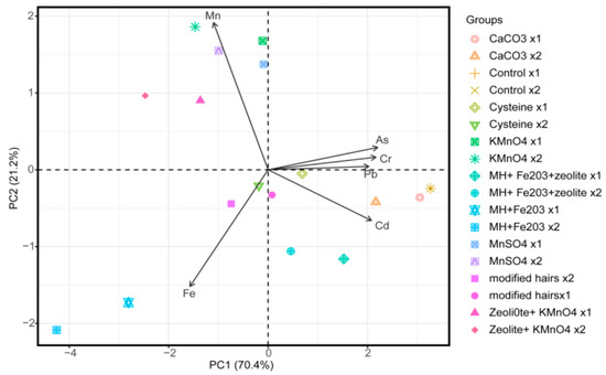 The results of the total concentrations of the above-mentioned elements in the soil is presented in Figure 2, which reveals that the first two components (PC1 and PC2) accounted for 90.4% of the total variation. In both biplots, the first component (PC1), which accounted for 68.8% of the total variation, illustrated that the highest contribution to total variation was from Cd content (21.30%), followed by Pb (20.23%), Cr (19.90%), As (18.45%), and Fe (10.64%), whereas Mn (9.45%) made the smallest contribution. The main attribute in variation were As, Cr, Fe, Mn, Pb and Cd and their eigenvectors are 4.12, 1.29, 0.24, 0.17, 0.08 and 0.07, respectively. The graph at the right axis of PCA shows a positive correlation among Mn, Cr, Pb, As and Fe. Mn and Cr show a positive correlation with both levels of T9 and Fe–As with T7. The concentration of Mn and Fe increased the concentration of TEs.