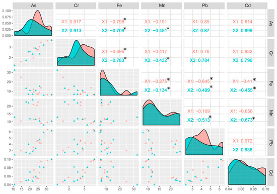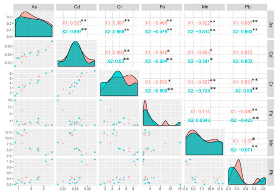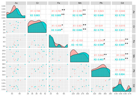 At the X2 level, all HMs showed a negative correlation with Mn and Fe, while a positive correlation was observed among TEs. A strong negative correlation was noted in Fe-Cd, Fe-As, Fe-Cr, and Fe-Pb. A negative correlation was found between Mn and the other elements, including Mn-Cd, Mn-As, Mn-Cr, and Mn-Pb.