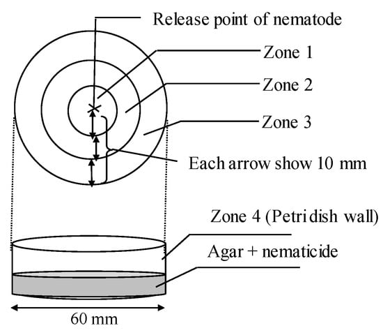 Hirschmanniella diversa spends its entire life cycle in paddy fields [7], where irrigation is frequently done. It is possible that nematodes may resume activity as the nematicide concentrations are reduced, or they may move to sites in a paddy field where less or no nematicides are present. Therefore, the nematistatic effect of selected nematicides was examined. H. diversa were removed from cold storage as mentioned above and kept in room temperature for 30 min to recover activity. Agar (10 mL, 1%) containing different concentrations of nematicides was prepared in a 6-cm diameter Petri dish. Agar containing only distilled water was used as the control treatment. As with the nematicidal test described above, active fourth-stage juveniles or adult H. diversa individuals (about 50 individuals. The ratio of juveniles and adults was similar to the nematicidal effect test) were picked and released into the center of the Petri dish (marked X in Figure 1). The Petri dishes were wrapped with Parafilm and placed in the incubator under optimal conditions (25.0 ± 1.0 °C). Five replicates were performed for each treatment.