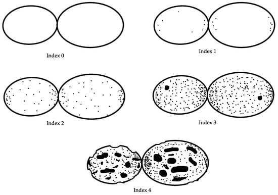 Schematic representation of the lotus tuber damaged by Hirschmanniella diversa as indexed from 0 to 4. 0: Not damaged, 1: Slightly damaged, little small black spots by H. diversa (less than 3 mm in diameter) on the tuber surface. No effect on the commercial value, 2: Many small black spots. Decreased commercial value, 3: Many small and big black spots (more than 3 mm in diameter). Deformed tuber surfaces, 20% reduction in marketable quality. 4: Critical damage to tubers. Highly deformed, many big black spots, >95% reduction in marketable quality.