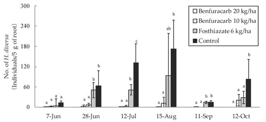 The density of H. diversa in lotus roots followed a pattern peaking around mid-August in the control treatment. This pattern was the same as that observed in conventional lotus cultivation [7]. Population dynamics in the fosthiazate treatment resembled that in the control plot and there were no significant differences between the two treatments during the study period, except for 12 July and 12 October. Benfracab application at rates of 20 kg/ha and 10 kg/ha significantly reduced the population of H. diversa compared to the control treatment (Figure 3) (p < 0.05; Tukey HSD test). Furthermore, benfuracarb and fosthiazate applications showed no phytotoxicity effects to the lotus plants (data not shown).