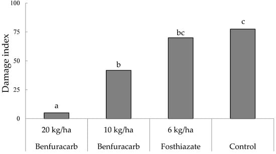The damage index was significantly lower in the treatment with benfuracarb at rates of 20 kg/ha and 10 kg/ha compared to that in the control treatment (Figure 4) (p < 0.05; Kruskall–Wallis test). By contrast, no significant difference was observed in damage level between the fosthiazate and control treatments (Figure 4).