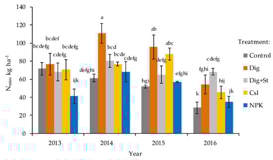 In the autumn, a significant interaction between factors was found only in the topsoil. In 2013, significant differences were registered between treatments, Dig, Dig + St, Csl, and NPK. In 2014, application of digestate significantly increased the N content compared to the other treatments. In 2015, digestate application also increased the NO3-N content the most, but there was no difference between Dig and Csl. In contrast, in 2016, the highest content of NO3-N was found in Dig + St treatment (Table 6).