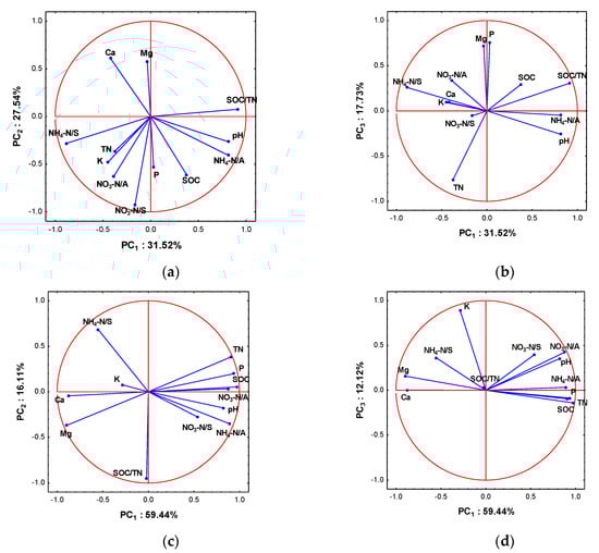 As shown in Figure 3a, the studied soil parameters can be divided into two groups. The first group includes SOC/TN, pH, NH4-N/autumn, and SOC, and the second group consists of TN, K, NO3-N/autumn, and NO3-N/spring. There was a negative correlation between variables representing the content of plant-available Ca and Mg, and variables constituted by SOC and plant-available P. However, as shown on the PC1−PC3 axes, some data for SOC positively correlated with Ca and Mg (Figure 3b). In respect to subsoil, the set of PF1 determinants was composed of SOC, TN, pH, P, NH4-N/autumn, and NH4-N/spring. Variables representing Mg and Ca had the highest loadings in PC2. As shown on the PC1−PC2 axes, SOC and TN were negatively associated only with the variables representing Ca and Mg content (Figure 3c). On the PC1–PC3 axes, the values of SOC, TN, and NH4-N/autumn were also closely interconnected (Figure 3d).