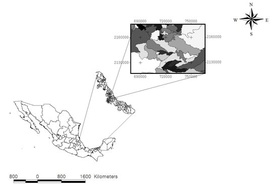 Mexico is one of the 14 countries with the highest greenhouse gas emissions; due to the progressive elimination of its forests, it also contributes with 1.5% of the global emission from fossil energy use [22,23,24]. Changes in land use in the tropical forests of Mexico are evident; over the period from 1500 to 1985 tropical forests decreased by 80% and the area of the grasslands increased by 50% [25]. In Mexico, the average of net C emissions as result of tropical forest conversion to agricultural land, fragmentation of forests and land degradation, was estimated at 20.8 Tg/year [26]. However, if natural areas were protected in Mexico, and also new plantations were restored and established, about 150 million Mg of could be mitigated, as estimated in [23]. In Mexico, forest plantations and agroforestry systems represent the greatest potential for the sequestration of C [14,27,28]. In that sense, several studies report that the coffee agroecosystem (AES), with diversified shade, has great potential to store and sequester [22,29,30,31,32,33,34,35,36]. Particularly, in the central region of Veracruz, in Mexico, coffee AESs are the most important agroforestry activity according to land use and other socioeconomic factors. Such AESs are characterized by presenting a diversified tree stratum that provides shade to coffee plants and multiple environmental services to society [25,37,38,39,40,41]. Regarding this subject, several studies show evidence proving that these AESs have high potential for the sequestration and storage of C [34,35,42,43,44]. There also exist some studies that estimate the amount of C stored in the aboveground biomass (leaves, branches and stems) of the tree vegetation present in coffee AESs [45,46,47,48,49]. However, there are no studies focused on classifying aboveground C storage at the regional level and by type of coffee AES. Therefore, this study estimates and compares the potential for C storage in the tree component and also estimates the spatial distribution of C density, for the different types of coffee AES present in the central region of Veracruz, in Mexico.