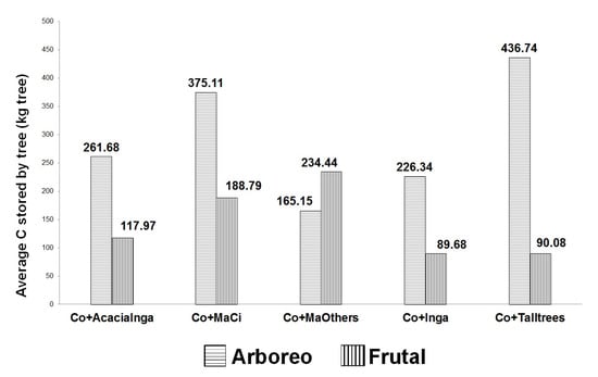 The results show that the Co + MaCi and Co + Talltrees AES present the species with the highest average values of C storage, and this is because more than 50% of the sampled species reached C storage greater than 200 kg. The lowest average values corresponded to the Co + MaOthers, Co + Inga and Co + AcaciaInga. In the fruit stratum, the highest values are distributed in the Co + MaCi and Co + MaOthers AES (Figure 3) because in these AES, the individuals of Mangifera indica are widely distributed with an average value of 429.60 and 767.8 kg C, respectively. The largest carbon storage by type of AES is associated with the presence of trees with higher values in height and DBH; the type of AES that presents individuals with lower carbon storage potential in the tree stratum corresponds to Co + Inga and Co + MaOthers, and in the fruit stratum corresponds to Co + Talltrees, Co + AcaciaInga and Co + Inga. The contribution of species depends on their density in each type of AES. The density of C by types of AES shows that with the exception of Co + MaOthers, the tree stratum always records the highest values (Table 5).