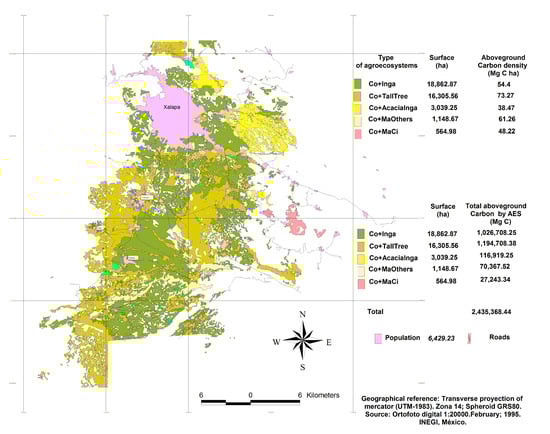 The potential storage of C in the coffee AES of the Xalapa–Coatepec region is 2.4 million Mg distributed across an area of 39,921.33 ha. Because of the extension they cover and their strategic geographical distribution in the central region of Veracruz, it is strongly suggested that these coffee AES be considered as sinks of C.