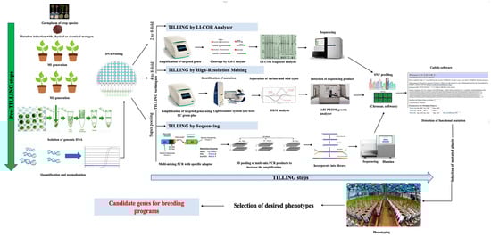 There are three key methods for screening mutant population using TILLING: first, the LI-COR method, which uses CEL I (celery enzyme) for mutation detection; second, high-resolution melting (HRM); and third, next-generation sequencing (NGS; Figure 1) [56,57]. Among all these methods, the preferred approach for TILLING in plants is LI-COR [58,59,60], a method developed in the early 2000s to investigate induced mutations that occur as a result of applying chemical mutagen [61,62]. High-resolution melting analysis is recent method for mutation detection [30,63]. The PCR reaction mixture gives higher resolution melt profiles using different temperatures that make it easy to detect SNPs in somatic mutations [64]. The proper balance of temperature and steady evaluation of fluorescence via instruments such as the Light Scanner System (Idaho Technology, Salt Lake City, UT, USA) or the Rotor Gene (Qiagen, Hilden Germany) enables individual mismatches to be detected in the target fragments from the mutant pools. HRM is a good choice when target genes have several small exons which are separated by large sequences of introns. HRM is also a quick assay, and is finished in a packed tube where there is no need for digestion or gel separation steps [30]. In hexaploid wheat, there are two main steps needed for the screening of mutation. The first involves a big fragment with many coding areas which is augmented using genome-specific primers, and the next step is HRM analysis, which uses specific primers for each exon [30].