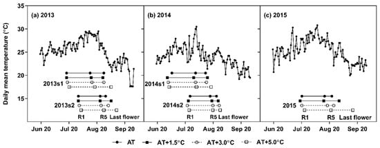 Daily mean temperatures under ambient temperature (AT) treatment in 2013 (a), 2014 (b), and 2015 (c). Horizontal bars represent the reproductive stages for each temperature treatment and growing season: R1 (first symbol), R5 (second symbol), and last flowering (third symbol).