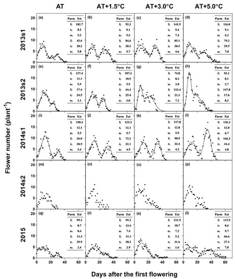 Temporal patterns of flowering for ambient temperature (AT) (a, e, i, m, q), AT + 1.5 °C (b, f, j, n, r), AT + 3.0 °C (c, g, k, o, s), and AT + 5.0 °C (d, h, l, p, t) in 2013s1 (a–d), 2013s2 (e–h), 2014s1 (i–l), 2014s2 (m–p), and 2015 (q–t) along with the bimodal model equations. The table in each graph represents the estimates (Est) of parameters (Parm).