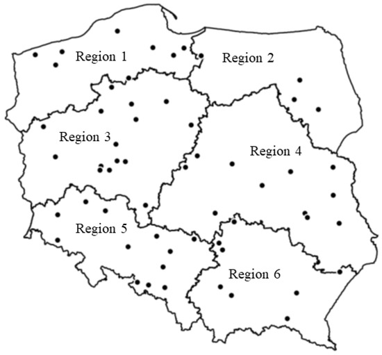 The data on grain yield used in this study come from multi-environmental trials (MET) in 58 locations (Figure 1) for 12 modern triticale cultivars during five growing seasons (years)—from 2009/2010 to 2014/2015. These MET experiments were carried out in the framework of the Post-Registration Variety Testing System, which is used for many crop species (e.g., cereals, industrial plants, and potato). Each of the 58 locations was assigned to one of six regions (Table 1). The division into regions is based on the climatic and soil conditions in Poland. However, their borders were created based on the administrative structure of Poland. The average annual rainfall in the regions ranges from 550 to 600 mm. This does not apply to mountainous regions (region 5 and 6), where the rainfall ranges from 1000 mm to even 1700 mm. Rainfall is distributed almost evenly throughout the rest of regions. Although the lowest rainfall is in the Central Poland. This is due to the lack of any hills on which wet masses could stop. The amount of rainfall in summer is higher than in winter (Table 1). The temperature course is quite similar; however, in regions 5 and 6 there are the largest temperature amplitudes and the longest period with snow cover. In Poland, soil quality is one of the lowest in Europe [1]. The soil quality in Poland is classified from the best soil to the worst soil using soil classes from I to VI. Triticale is most often grown on soils of class IV and V. Soils of these classes account for about 65% of all soils in the six regions. Percentage shares of each soil class in arable land of studied regions are presented in Table 2. The values come from the Polish Central Statistical Office. In each studied location the triticale cultivars were grown at two levels of crop management intensity - a moderate-input crop management (MIM) and a high-input crop management (HIM).