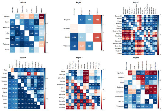 In addition, we examined the compatibility of cultivars’ rankings between locations in the same region (Figure 3). The high consistency of the rankings within each region would mean that the regions were well assigned and represent similar conditions for the cultivation of triticale. Results presented in Figure 3 suggest similarity in the adaptation of cultivars between locations in regions 1 and 4. In other regions (2, 3, 5, and 6), we observe incompatibility of the cultivar yield rankings between locations (Figure 3). The values of Spearman’s rank correlation coefficients were under 0.50 and were often negative. It can be noticed that the correlation coefficients were different for the two crop management intensities. The best compatibility of cultivars yield rankings was observed for the locations of the region number 4 for both levels of crop management intensity. Surprisingly, cultivars’ rankings between regions were more consistent and comparable than inside the regions for both levels of crop management (Figure 2).