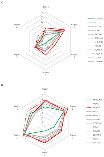 In the next step, we examined the adaptive response of 12 triticale cultivars for two crop managements, MIM and HIM. The response of the triticale cultivars tested under different environmental conditions is similar for both levels of crop management intensity; however, it is not the same (Figure 4a,b). The highest yielding cultivar in most of the studied environments at MIM is Pizarro (but in regions 5 and 6 it was the 8 and 9 lowest yielding cultivar, respectively) and Sorento (Figure 4a). Nevertheless, the highest yielding cultivar in most of the regions at HIM is Algoso (Figure 4b). The remaining cultivars, although they could have been the highest yielding ones, were cultivars with narrow adaptability, because only in some of the regions they achieved high yields. Agostino at high-input management is the lowest–yielding cultivar of all other cultivars, except for region 6, where it is ranked third among the highest yielding cultivars. Also at MIM, Agostino is poorly yielding in most regions, although slightly better in comparison to HIM in regions 1–4, while in region 5 it is a very high yielding cultivar.