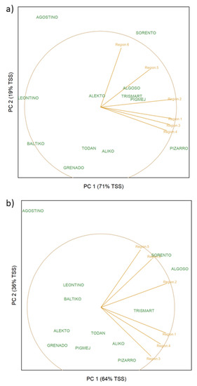 Cultivars widely adapted to the regions of Poland at both levels of crop management intensity were identified on the basis of the GGE biplots (Figure 5a,b). The Sorento cultivar was well-adapted in region 5 and 6 at the MIM crop management (Figure 5a). These two regions can be considered to be one mega-environment. Pizarro was well-adapted in the remaining four regions (region 1, 2, 3, 4) at MIM. These four regions form the second mega-environment. Similarly, at HIM we can distinguished two mega-environments (Figure 5b). Regions 2, 5 and 6 form the first mega-environment in which Sorento and Algosto can be considered to be well-adapted cultivars. The second mega-environment is formed by regions 1, 3 and 4, and there Pizzaro can be considered a well-adapted cultivar.