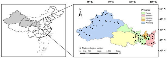Northwest China is located between latitudes 31° and 48° N and longitudes 73° and 111° E with an area of 310.7 × 104 km2, accounting for 32.8% of China’s land area. Northwest China consists of five provinces: Shaanxi, Gansu, Qinghai, Ningxia and Xinjiang (Figure 1). This region is located in the centre of Eurasia. The climate is a typical arid and semi-arid continental climate, which is characterized by low and irregular precipitation and higher evaporation. The annual average air temperature is from −2 to 14 °C, the annual average precipitation is 50–800 mm, gradually decreasing from the southeast to the northwest, and the annual average evaporation is 1400–3200 mm [13]. Northwest China is a major potato producing area in China. Potatoes in northwest China are usually sown from late April to early May and harvested from late September to early October. Potatoes in Xinjiang are mostly irrigated, and the other four provinces are mostly rain-fed. The potato growing areas in Xinjiang are mainly distributed along the northern and southern slopes of the Altai, Kunlun and Tianshan Mountains. Potato planting areas in Qinghai are mainly distributed in the eastern part of the region. Potato growing areas in Gansu are mainly distributed in the central part of the region. Ningxia potato planting areas are mainly distributed in the southern mountains of the region. Shaanxi potato planting areas are mainly distributed in the northern and southern parts of the region.