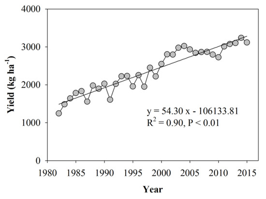 In general, crop yields can be expressed as the sum of management, climate contributions, and random error at any year [29,30]. The crop yield induced by crop management (including technological changes and any other non-climatic factors) mainly depends on the development level of productivity (science and technology). The crop yield induced by climate, also known as fluctuating yield, mainly reflects the short-term yield fluctuation caused by changes in climate factors.