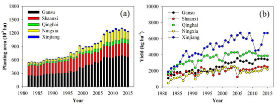 Changes in potato yields and planting areas from 1982 to 2015 in different provinces of northwest China.
