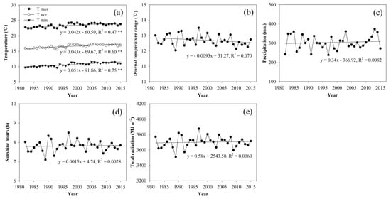 Fit lines were implemented to reflect the trends of climatic factors from 1982 to 2015 (Figure 4). According to the slope of the linear response curve in Figure 4a, Tave, Tmax, and Tmin increased significantly at rates of 0.42, 0.43, and 0.51 per decade, respectively (P < 0.01). The diurnal temperature ranged between 12.0 and 13.5 °C, which showed a downward trend (−0.093 °C per decade), but the change was not significant (Figure 4b). Prec, S and Rs showed increasing trends (3.4 mm, 0.015 h and 5.8 MJ m−2 per decade, respectively), but the changes were not significant (Figure 4c–e).
