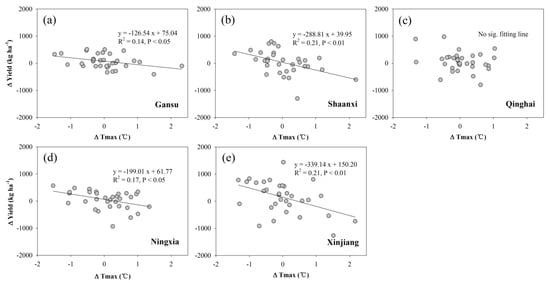 Relationships between changes in the daily maximum temperature and potato yield in different provinces of northwest China.