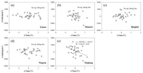 Relationships between changes in the daily minimum temperature and potato yield in different provinces of northwest China.
