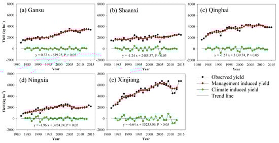 Changes in potato observed yield, management-induced yield and climate-induced yield in different provinces of northwest China.