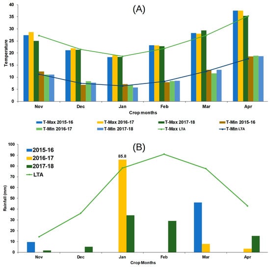 Monthly mean maximum and minimum temperature (A) and monthly total rainfall (B) at IIWBR, Karnal during experimental years compared with long-term averages (1972–2017).