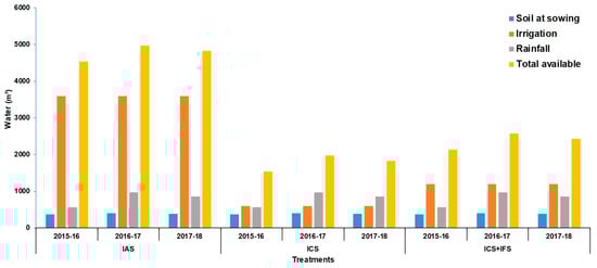 The experiment involved a split split-plot design where in the main plots had RRR at 4 ton ha−1 equivalent to anchored residue left behind by the combine harvester [] and control where no residue was retained. In the sub plots three irrigation levels were allocated viz., 1. Irrigation at Crown root initiation Stage (ICS): One irrigation at CRI stage (Zadoks = 21), 2. two irrigations one each at CRI (Zadoks = 21) and Flowering Stage (Zadoks = 60) (ICS+ Irrigation at Flowering Stage (IFS)) and 3. six Irrigations at All critical growth Stages (IAS) viz., CRI, late tillering, late jointing, flowering, milking and dough []. The quantity of water (m3) available to the crop under different treatments is presented in Figure 2. The sub-sub plots included foliar application of K at 2% through potassium sulphate fertilizer (K2SO4) at two crop growth stages (Zadoks 40 and 60) and its control treatments. The foliar application of K was carried out with a carrier volume of 400 L water ha−1 using a knapsack sprayer (Aspee Napsak Sprayer (SRP/50)) fitted with two flat fan nozzles. The method of irrigation at each growth stage involved pumping of water from a tubewell and carried to the experimental field via gravity flow in irrigation channels running adjacent to the experimental plots. The existing practice of irrigation in Indo-Gangetic plains of India, in which at least 60 mm of water is being applied by surface flooding method []. Irrigation treatments were precisely imposed on each plot by measuring the amount of irrigation water applied using a Cutthroat Parshall flume (discharge measurement flume) supplied by Hydro Flow-Tech, India.