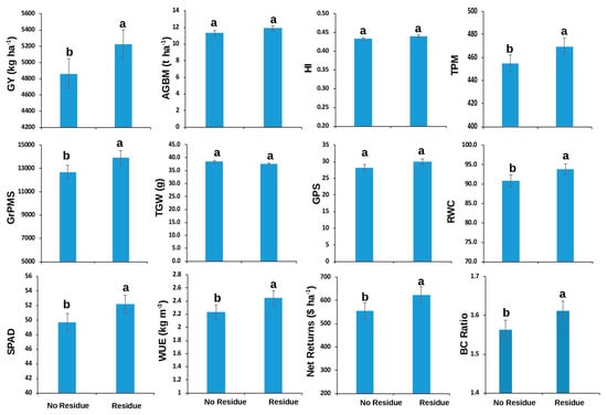 Effect of Rice Residue Retention on GY, AGBM, HI, TPM, GrPMS, TGW, GPS, RWC, SPAD, WUE, Net returns, and BC ratio of wheat. Means having different letter are significantly different from each other at 5% significance level. Note: GY: Grain Yield (Kg ha−1); AGBM: Above ground biomass (t ha−1); HI: Harvest Index; TPM: Tillers Per meter square; TGW: Thousand Grains Weight (g); RWC: Relative Water Content; SPAD: Soil Plant Analysis Development (Chlorophyll content); GPS: Grains Per Spike; GrPMS: Grains Per Meter Square; WUE: Water Use Efficiency (Kg m−3)