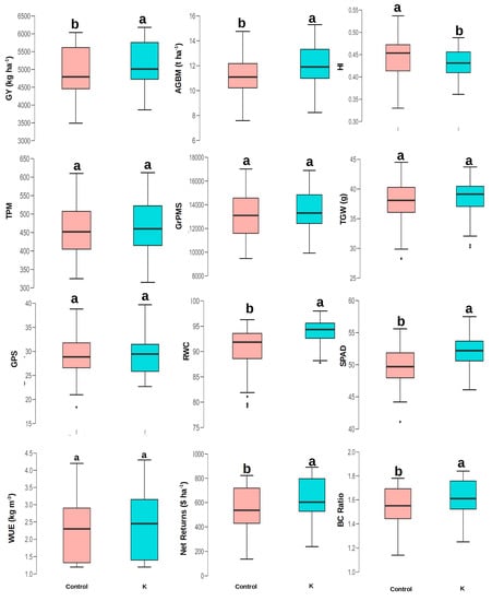 Effect of foliar application of K on GY and profitability parameters of wheat. Thick dark horizontal lines show the averages, the box provides the total variation for the 2nd and 3rd quartile, whiskers have the length of one standard deviation, and dots above or below standard deviation lines indicate the outlier values. Boxplots having different letter are significantly different from each other at 5% significance level. Note: GY: Grain Yield (Kg ha−1); AGBM: Above ground biomass (t ha−1); HI: Harvest Index; TPM: Tillers Per Meter square; TGW: Thousand Grains Weight (g); RWC: Relative Water Content; SPAD: Soil Plant Analysis Development (Chlorophyll content); GPS: Grains Per Spike; GrPMS: Grains Per Meter Square; WUE: Water Use Efficiency (Kg m−3)