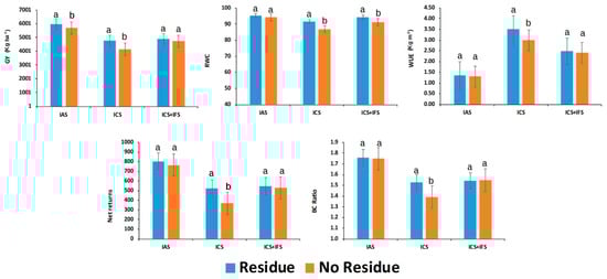 Wheat GY, RWC, WUE, NR, and BC ratio were significantly affected by interaction of residue retention treatment and irrigation levels. GY was significantly increased under IAS and ICS treatments when residue was retained. The increased GY under IAS is similar to individual effect of residue retention while in case of ICS, significantly higher GY might be due to decreased soil water evaporation due to residue retention [,,,]. In this study residue retention under IAS treatment did not have any significant effect on RWC, this might be because under IAS there was no dearth of soil moisture. In case of ICS and ICS + IFS, as there was moisture stress, the RRR enhanced RWC significantly compared to residue removal due to residue acting as soil mulch in protecting moisture loss. Increase in WUE values was highest under ICS treatment with residue retained, again might be due to the obvious fact that residue conserved soil moisture, suppressed weed growth, and created a favorable microenvironment in the root zone. Residue retention under ICS condition led to enhanced net returns and B:C ratio compared to residue removal because of the higher GY and WUE under this interaction.