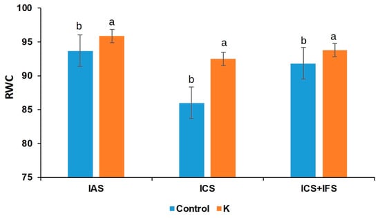 Interaction effect of residue retention and foliar application of K was statistically insignificant across all traits studied. When interaction of irrigation levels and foliar application of K was studied separately, only RWC was found to be varying significantly (Figure 6). When K was sprayed on the canopy the RWC under ICS (92.5) was not statistically different to ICS + IFS treatment (93.8).