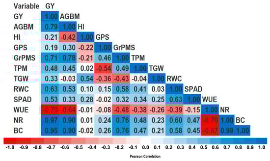 There was strong positive correlation between GY and AGBM (r = 0.79), GrPMS (r = 0.71), RWC (r = 0.63), SPAD (r = 0.53), net returns (r = 0.97), and BC ratio (r = 0.95). HI, GPS, TPM, and TGW were weakly correlated with GY. WUE showed a strong negative correlation with GY (r = −0.70) (Figure 7), however there was positive relationship between WUE and GY when the amount of water was the same (data not shown).