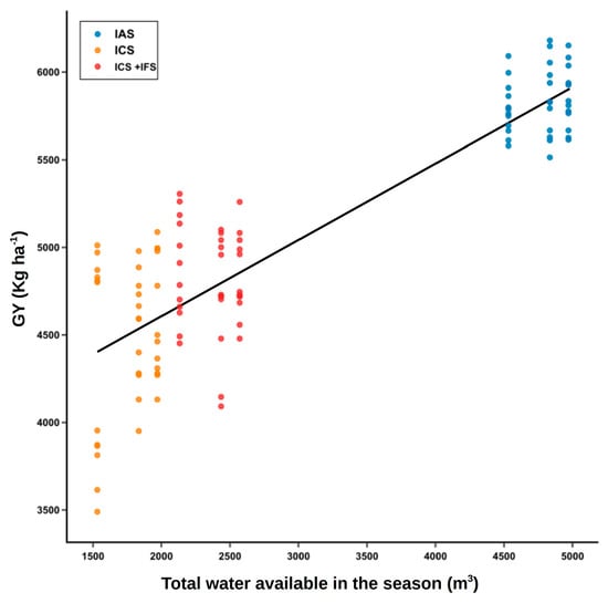 The regression analysis performed between water available to the crop and GY indicated a positive linear relationship (R2 = 0.761) (Figure 8). ANOVA of residuals indicated that the effect of RRR, irrigation levels and foliar application of K and interaction between RRR and irrigation levels were significant (Table 2).