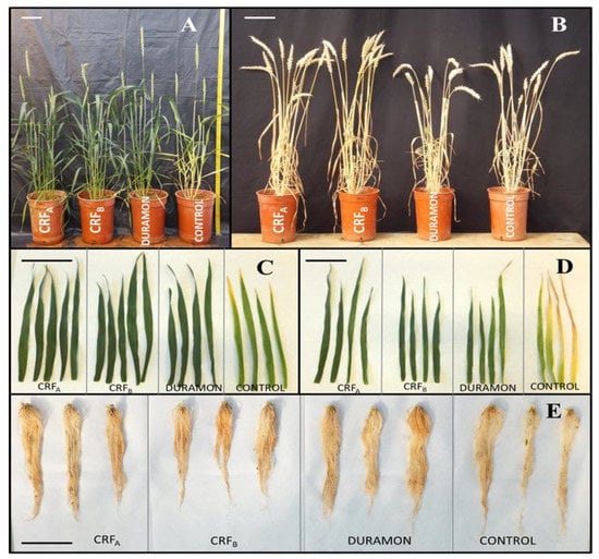 Responses of fertilizer treatments on plant growth (A,B), foliar area (C,D) and root development (E) of Triticum aestivum in the phenological state of panicles swelling (A,C,D,E) and at the end of the experiment (B). Treatments from left to right: CRFA, CRFB, DURAMON®, and CONTROL. Bars correspond to 10 cm.