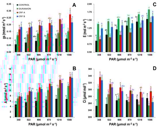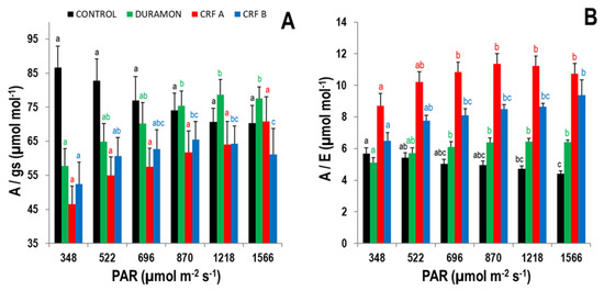 The levels of gs, A and Ci for CRFA were higher than those found for CRFB and DURAMON® but were lower for E. Significant differences were found in all the studied gas exchange parameters between CRFs and DURAMON®. After the maximum PAR application of 1566 µmol m−2 s−1, the levels of A did not significantly differ for both CRFs, but gs and Ci were 1.3- and 1.1-fold significantly higher for CRFA than for CRFB. At the same PAR, the A levels were 1.3-fold significantly higher for CRFs than for DURAMON®. The gs and A levels for the CONTROL plants were significantly lower at all the studied PAR compared to those of the different treatments. However, the E and Ci levels for the CONTROL plants were only significantly different for DURAMON®, as was Ci with CRFA. A/gs significantly differed when globally comparing CRFs with DURAMON® and the CONTROL (Figure 3A), but the A/E levels were significantly higher for CRFA than for CRFB, DURAMON® and the CONTROL, which also significantly differed from one another. The maximum A/E levels were produced within the 870 to 1218 µmol m−2 s−1 range (Figure 3B). The A/E levels in the CRFA leaves were 1.3- and 1.8-fold significantly higher than CRFB and DURAMON® at a PAR of 870 µmol m−2 s−1.