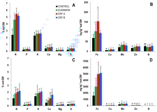 Macro- (A,C) and micronutrient (B,D) contents in leaves (A,B) and roots (C,D), for the different treatments with the polymeric-coated fertilizers (CRFA, CRFB), DURAMON®, and the CONTROL in the phenological state (booting stage). Results of macronutrients (N, P, K, Ca, Mg, and S) are expressed in percentage of DW, and micronutrients (Fe, Cu, Mn, Zn, B) in mg kg−1 DW. Values are means ± SD (n = 4). Different letters for a specific macro- or micronutrient in each panel indicate statistically significant differences between treatments (ANOVA, P < 0.05).