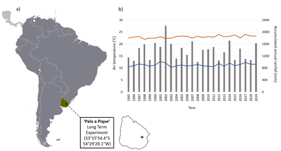 Location of the ‘Palo a Pique’ long-term experiment of the National Institute of Agricultural Research (INIA) in Uruguay (a), and annual accumulated rainfall (grey bars), mean maximum air temperature (orange line) and mean minimum air temperature (blue line) from 1995 to 2019 (b).