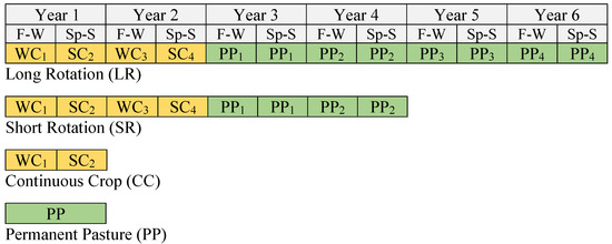 Later, in 2012, a second 6 ha paddock was incorporated to the CC rotation (Figure 2b). Hence, the three rotations having crops (CC, SR, and LR) could have a cycle represented by a sequence of four crops in two paddocks. Previously, that was true only for SR and LR, but CC had only a cycle of two crops in one paddock.