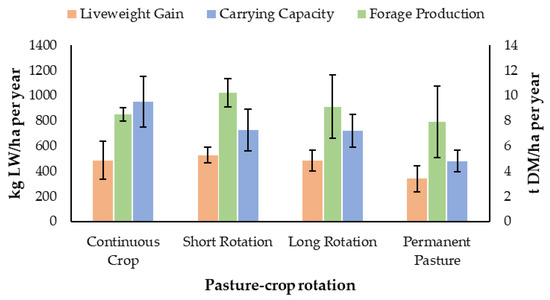 From the livestock production standpoint, average liveweight gains (± standard deviation) for the first four years of the experiment ranged from 338 ± 103 to 527 ± 61 kg/ha per year, whilst average forage production ranged between 7.9 and 10.2 t DM/ha per year, allowing an animal carrying capacity between 480 and 951 kg LW/ha per year (Figure 5) ([14]. These KPI values are between two and four times greater than those recorded in traditional livestock production systems in Uruguay in terms of liveweight gain production, pasture production, and stocking rate (105 kg LW/ha, 4.4 t DM/ha, and 300 kg LW/ha per year, respectively) [30]. Production intensification is one way to reduce carbon footprint per animal and per hectare [31]. In Uruguay, Picasso et al. [32] found that for every 10 kg increase in productivity (kg LW/ha per year), the carbon footprint decreases by 1.2 kg CO2e/kg LW and 36 kg CO2e/ha.