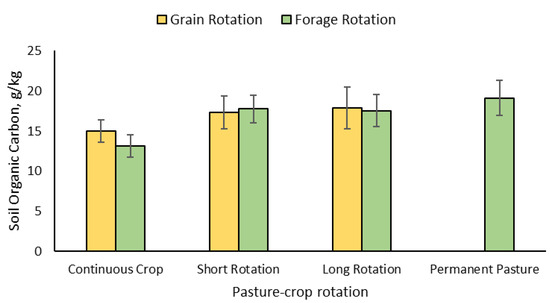 Crop–livestock rotation impact on soil organic carbon (SOC, 0–15 cm depth) from the ‘Palo a Pique’ long-term experiment (1995–2003). Content of SOC in continuous cropping was significantly lower than SOC in the other rotations. Adapted from Terra et al. [18].