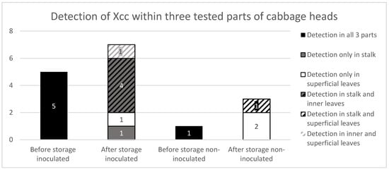 Despite the fact that the growth-limiting temperature for Xcc was estimated as 5 °C, the increase of Xcc occurrence after storage was observed in this study [42]. On Xcc-inoculated cabbage heads, Xcc presence was higher on cabbage stalks and inner leaves, while on non-inoculated heads the infection on superficial leaves was more frequent and no infection was detected on inner leaves. These findings suggest that inoculation with Xcc was successful, while some cabbage heads from non-inoculated seeds were naturally infected in the field and Xcc symptoms developed from the inside during the post-harvest period.