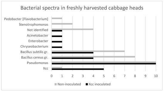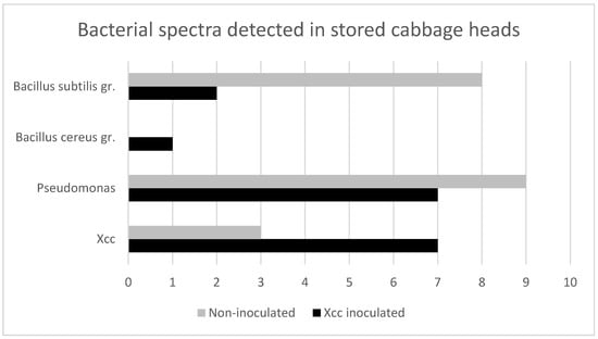 After storage, no other bacterial genera besides four tested ones were present on cabbage heads. The Bacillus cereus group was detected only in one Xcc-inoculated cabbage head, however, its presence markedly decreased (Figure 3).
