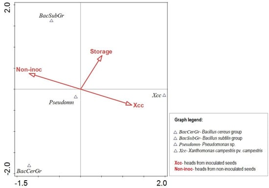 We showed significant differences in the bacterial spectrum of cabbage heads, in relation to the time point of sampling (before and after storage) and seed inoculation with Xcc. Plants after harvest are generally more vulnerable to infections due to loss of their defense mechanisms against microorganisms [44]. An increase of microbial populations was confirmed by King and Bolin in stored lettuce [45]. Pseudomonas species appeared more on cabbage heads at harvest, however, the bacterial spectrum changed over time in favor of this genus. The decline of other bacterial genera after four months of cold storage was also observed in our previous study [21] and it could be explained by strong antagonistic behavior of Pseudomonas sp. [46] and Bacillus species against other bacteria [47,48].
