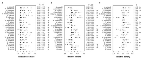 Seed dimensions—following [19], five seeds per cohort were measured by digital scales NTD12P-15CX (Mitutoyo Corp., Kawasaki, Japan) with a precision of 0.01 mm. The following dimensions were measured: length (L; the longest dimension of the seed), width (W; the longest dimension perpendicular to L within the same plane), and height (H; the longest dimension perpendicular to the plane of L and W). Based on these measurements, the following metrics of the seed form were calculated for each of the five seeds per combination of species and cohort, except for density, which could only be estimated as a mean value:
