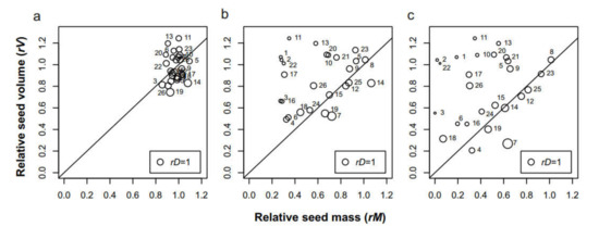 Interrelationship between relative mass (rM), volume (rV) and density (rD) of 26 species of seeds (for species codes, see Table 1). Fitted values from the best models shown in Figures a, b, and c were used, the line of slope = 1 indicates the situation when relative mass and volume declined at the same rate so rD did not change. Sizes of the symbols are scaled according to the size of change in rD, the symbol size shown on the bottom right equals rD = 1, smaller or larger symbols refer to proportional decrease or increase in rD, respectively. (a) YAB 1; (b) YAB 5; (c) YAB 8.