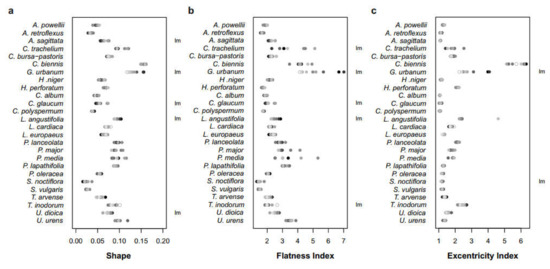Variation in seed form with year after burial (YAB) for 26 species of seeds: (a) seed shape; (b) flatness index; (c) eccentricity index. The value of 0 indicates perfectly spherical seeds, while the value of 0.2 indicates flat or elongated seeds (Figure 3a). The larger the number the flatter (Figure 3b) or eccentric (Figure 3c) the seeds were. The decrease in the intensity of grey colour refers to the increase in YAB (i.e., a decrease in the intensity of grey colour): black = control, white with grey lining = YAB 8 are the two extremes). Lm (linear) indicates the cases when the change in the trait over time was significant according to the linear model. See Table 1 for generic names of each species.