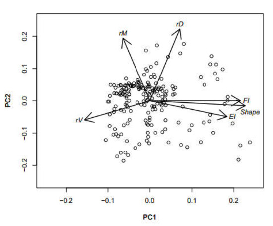 The shape of seeds remained similar overall, as the three indexes of the seed form varied with YAB in only a few species (Figure 3a–c). Principal component analysis, however, revealed patterns in seed form changes across seed species and YAB (Figure 4). The PC1 axis explained 48.4% of the variance and presented the change in external seed form as Shape, FI and EI correlated positively and rV negatively with this axis. This suggests that seeds that change their shape also lose their volume as they either shrink and become flatter or lose their extremities. The PC2 axis explained 27.3% of the variance and was well correlated positively with rM and rD, i.e., represented by seeds that did not change their volume but changed their mass and hence density. The individual variation in all morphological traits with YAB for each of the seed species can be found in the Appendix S1: panels A–F.